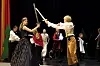 SVERDKAMP: Dronning Ithil ( Julia) og Kongen Anor (Sigurd) møtes i den store kampen med alle sine soldater. I bakgrunnen: Prinsesse Naur (Ingeborg), prinsesse Nen (Helene) og riddere (Natalie, Martine og Ask).