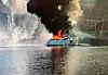 BÅTBRANN: En heftig båtbrann ved Strandkaien hindrer askøyruten.