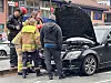 RYKKET UT: Nødetatene rykket ut til brannutvikling i en bil på bussholdeplassen utenfor Kleppestø senter.