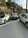 TRANGT: Harald Veisdal i Teslaen klarer bare såvidt å manøvrere seg forbi de feilparkerte bilene.
