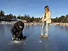 - TRYGT: Terje Alvheim måler isen på Solåsenvatnet mens datteren Line følger med.