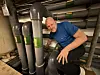HER GÅR VANNET: Hallvert Eirik Juvik tømmer bassenget i gamle Askøyhallen for siste gang.