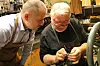 NØYE: Arbeidet på Skomakerhuset krever både presisjon og konsentrasjon.Mahmoud Khalil Mohammed og Harald Valdersnes møttes her for seks år siden, og har sydd sammen et solid vennskap.