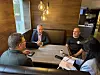 STØTTE: Øyvind Lavik i H. Brakstad eftf AS (med ryggen til) og Sveinung Giil i Konsumgruppen er på plass i restauranten til Svingen Pizza. Her sammen med Ahmad Hamad Shamsedin og hans kone og medeier Shelan Rasool. – Vi kan ikke forstå at dette er en video som stammer fra en fersk burger, er de samstemte om.