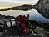 BLOMSTER: Jonas Bekkenes la ned en bukett med roser og lykter ved båtplassen til Oddvar her på Hanøy.