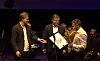 OVERREKKELSE: Tommy Jakobsen, Guros pappa, får overrakt prisen Askøyladden 2025. A24s nyhetsleder Sondre Hansmark (tv.) og Askøyværingens redaktør Leif-Kjartan Bjørsvik.