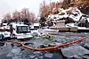 KUN BAUGEN STIKKER OPP: Askøy Brann og redning har lagt ut absorberende oljelenser rundt ulykkesstedet.
