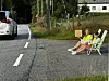 Med hver sin Trygg Trafikk-vest, strandstol, 50-plakat og «kamprop», satte Nilla (9) og Mia (10) seg ned ved veibanen i Kjerrgarden for å oppmuntre trafikantene til å holde fartsgrensen.