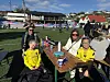 PAUSE: Denne gjengen koser seg gløgg i hjel under årets Hetlevik Cup. Foran sitter Hetlevik-spillerne Fride og Thale, bak sistnevnte er Lisa, mens Petter har Hedda på skuldrene,