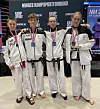 MEDALJER: Filip Larsson-Fedde (f.v.), André B Gundersen, Lukas Steen Karlsen og Vår Henhjum tok med seg medaljer hjem fra Taekwon-Do NM i Trondheim.