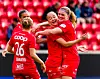 HISTORISK: Maren Johnsen blir dent første akademispilleren på damesiden i klubben som får A-lagskontrakt. Her feirer hun sammen med Signe Gaupset etter sin første scoring for Brann.