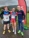 Rebekka Birkeland i midten smiler fornøyd etter rekordløpet sitt. Hun flankeres av Sakarias Breivik (t.v.), og sin gode medhjelper under løpet Marius Sørli.